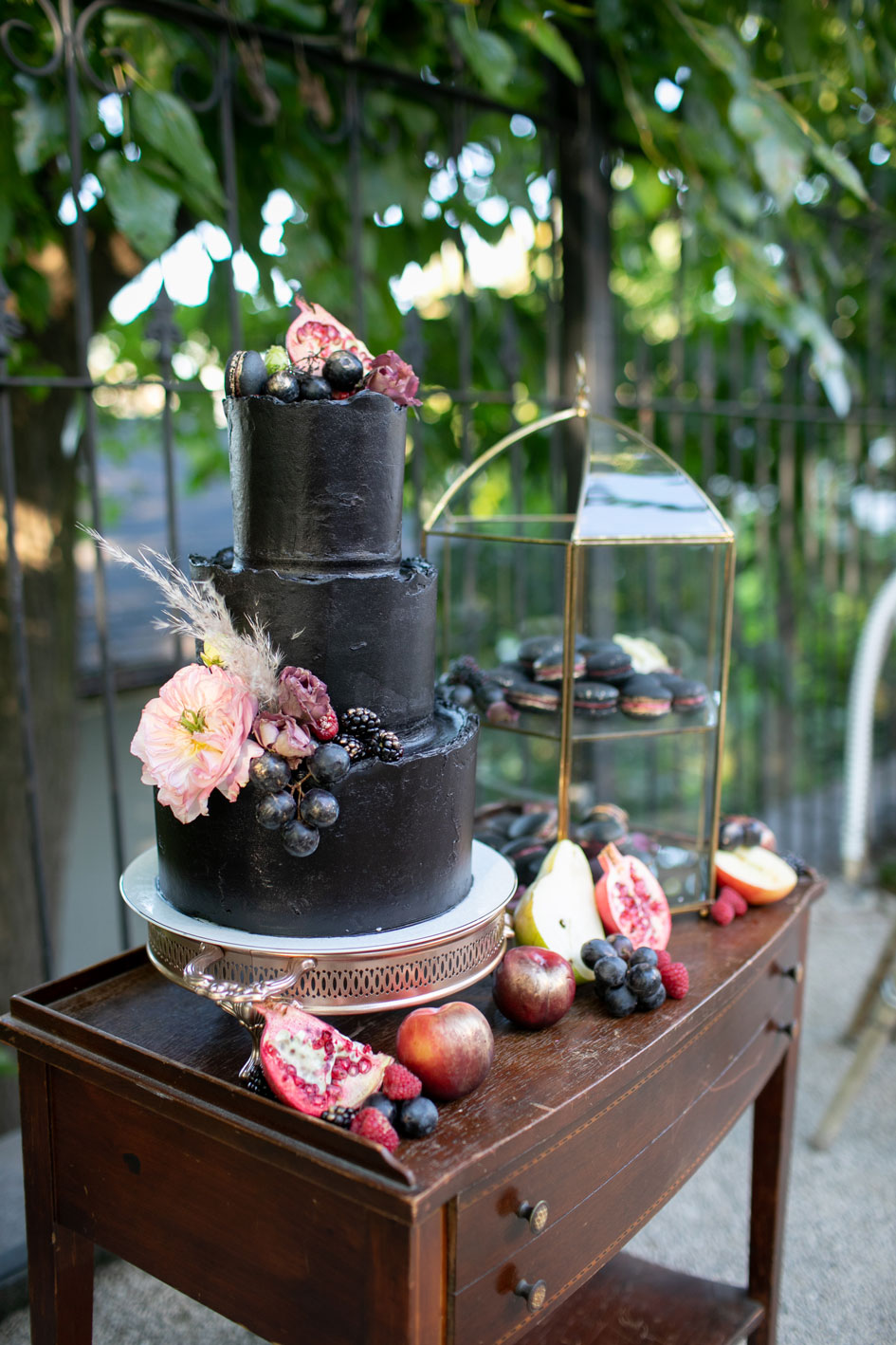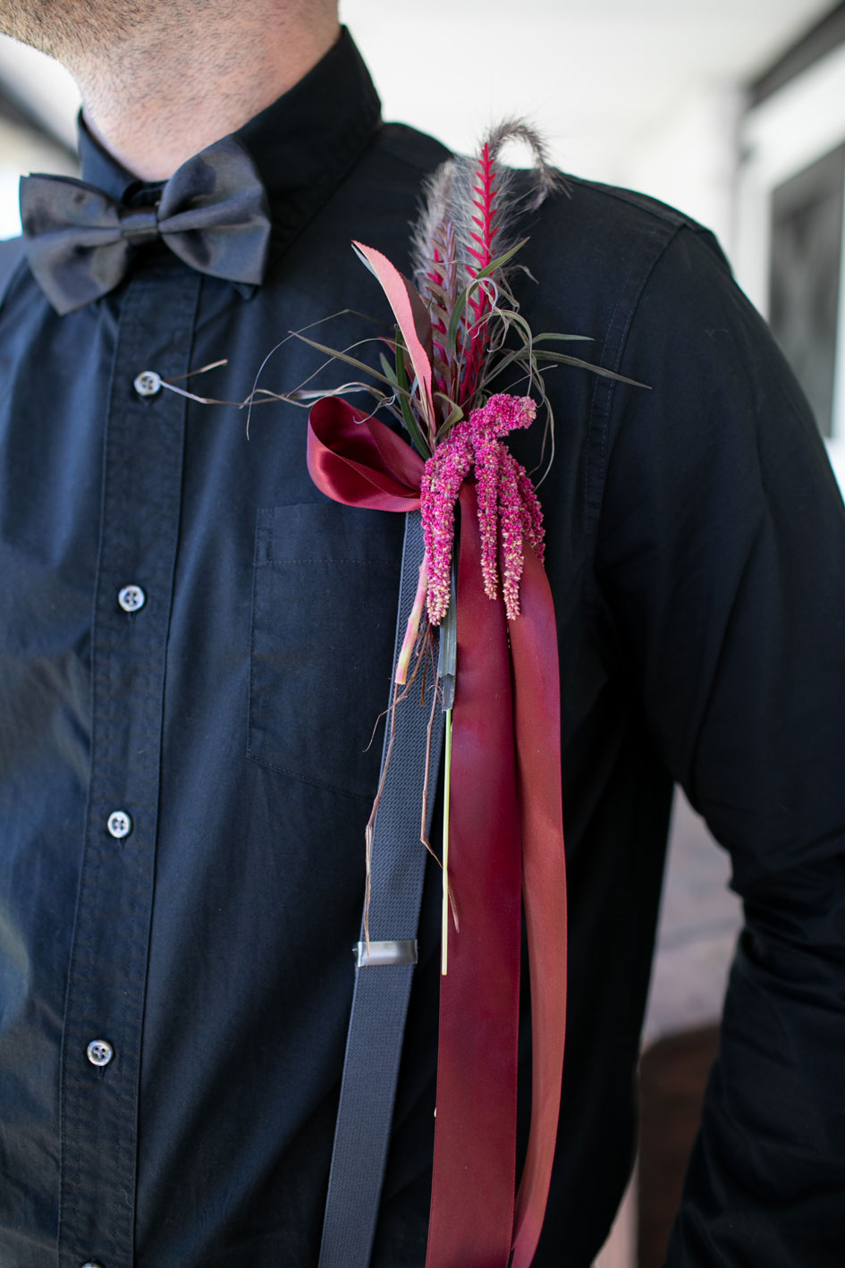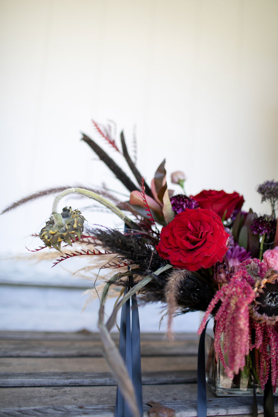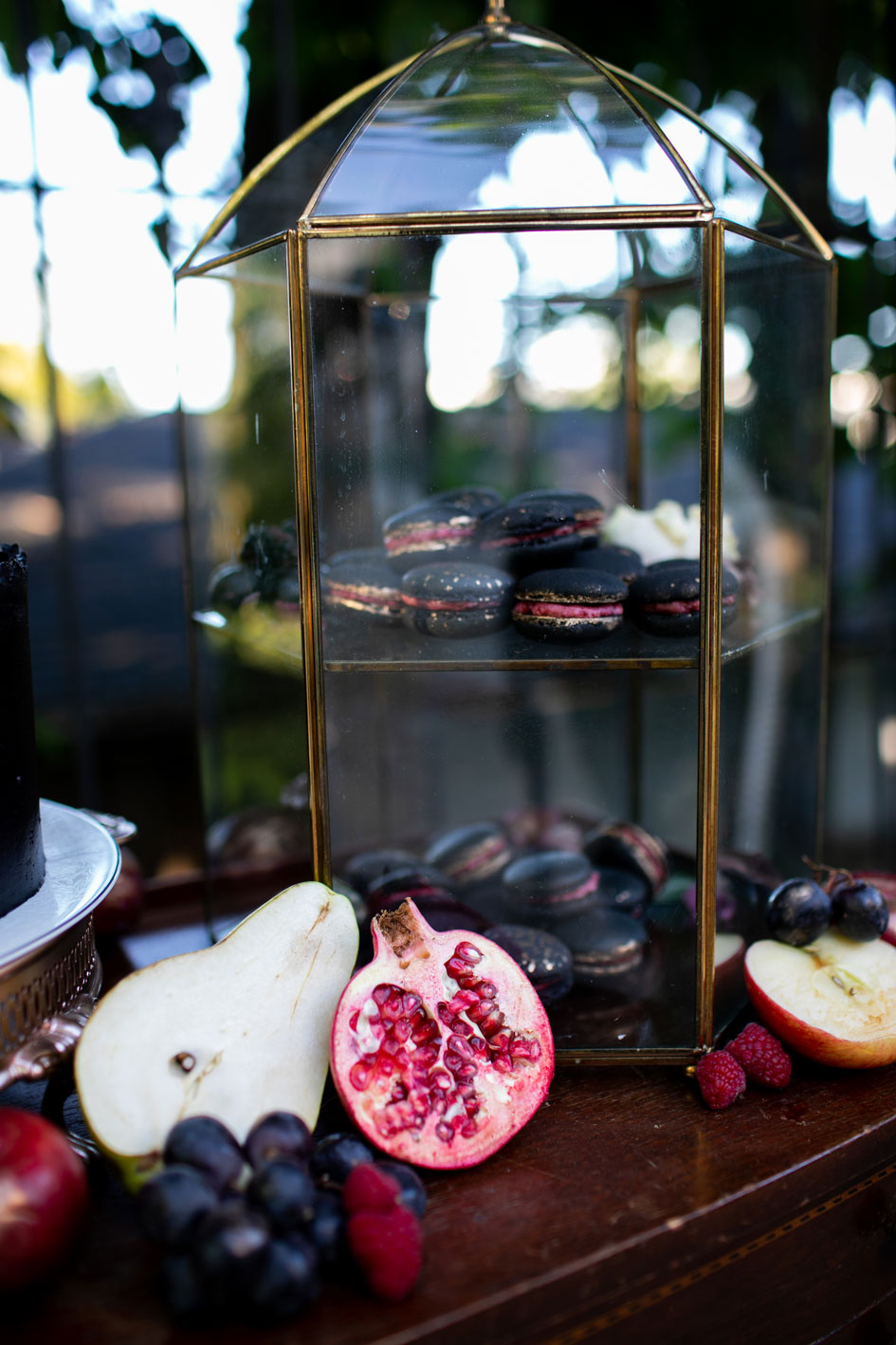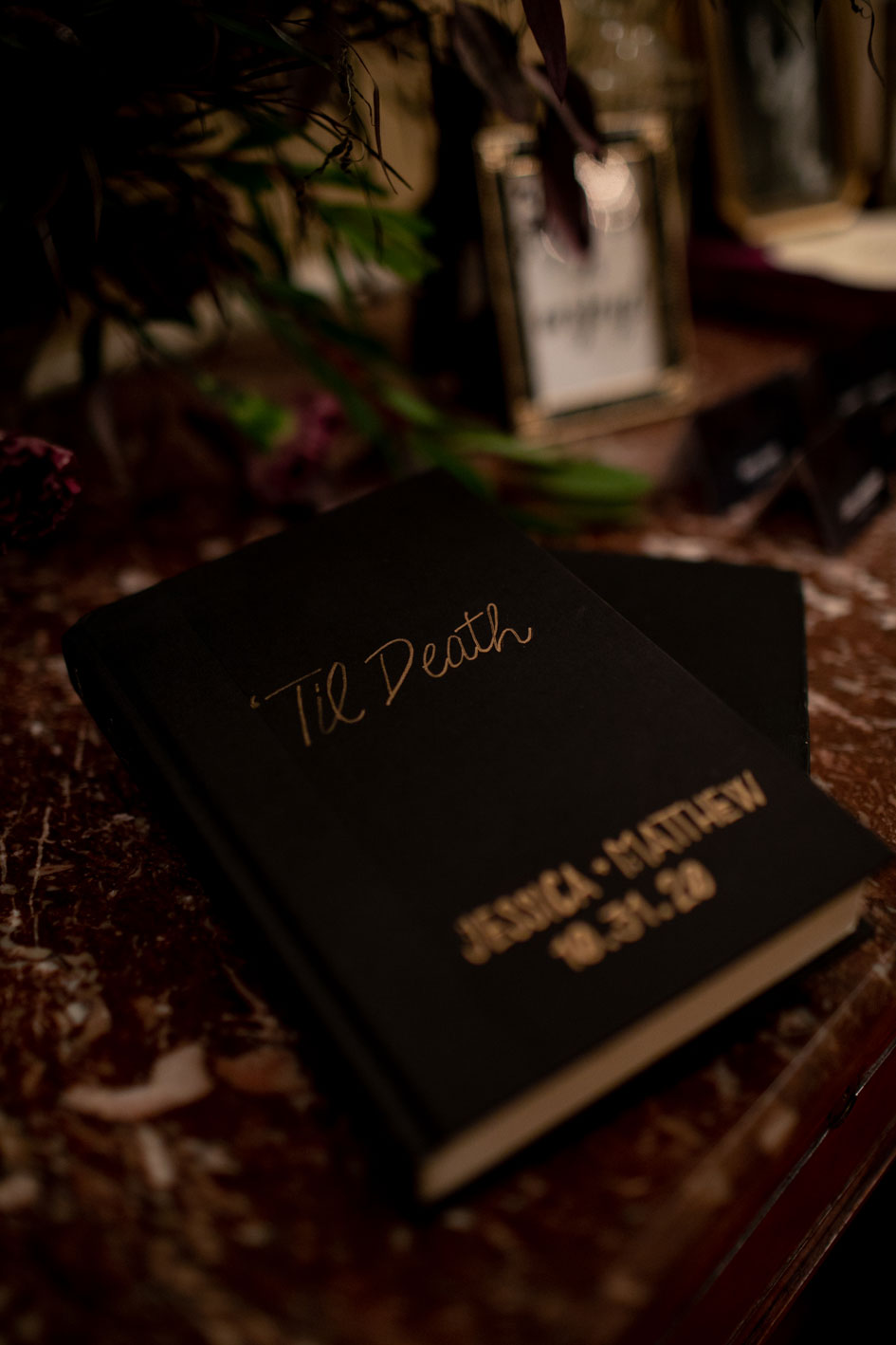 Photographer Elyse Bullard couldn't wait for the Halloween season to begin, so she got in touch with a few local vendors and began pulling together a haunted styled shoot. The history at Maxwell Mansion inspired a 1920's themed shoot for the beginning of the day, with the bride in a lacy sleeveless gown and carrying a rich red and maroon bouquet. As the sun went down, things began to change. The couple transformed into skeletal beings in black attire and toasted one another with blood-red goblets. Gold, maroon and deep purple accents glittered from the table where a black cake dripped with fruit. At the end of the evening, a vintage motorcoach arrived to whisk the couple back to the underworld.
