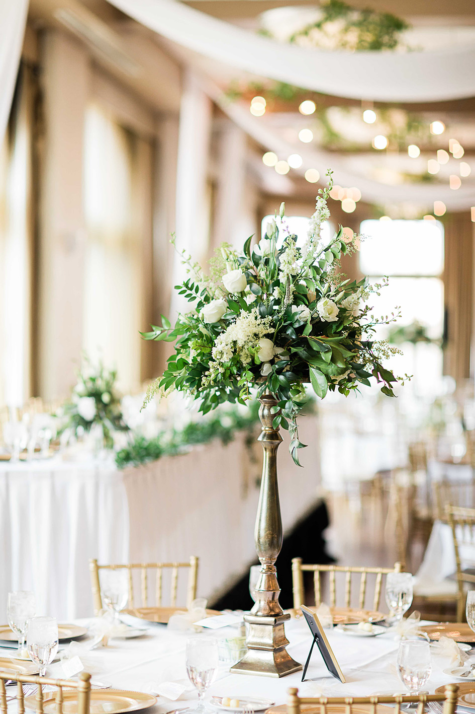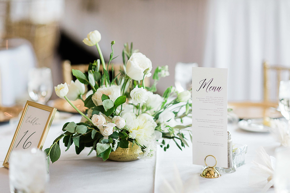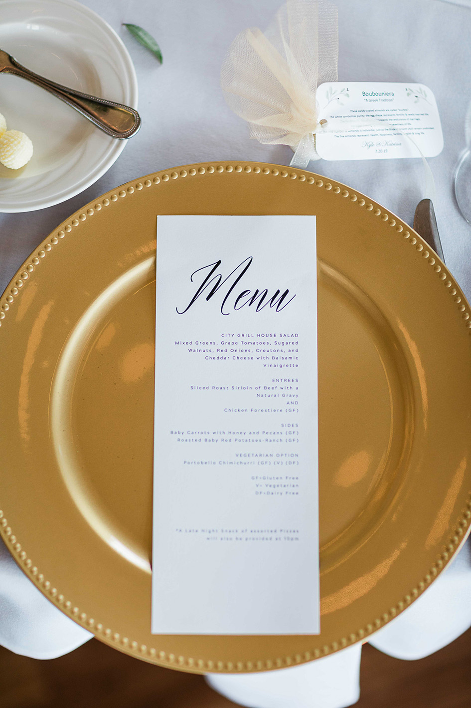 For the ceremony, the bride opted for a timeless affair with beige ensembles for the bridesmaids and classic black tuxes for the groomsmen to complement the domed ceiling paintings and ornate details in the church. To honor Katrina’s Greek heritage, the reception included boubounieres koufeta as favors—five Jordan almonds wrapped in small net bags to symbolize a newly married life, along with health, happiness, fertility, wealth, and a long life.