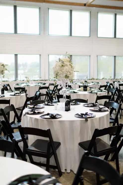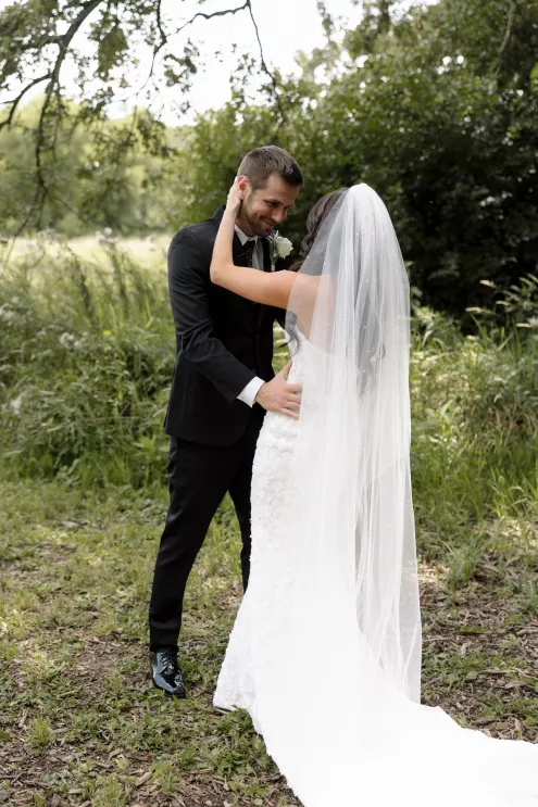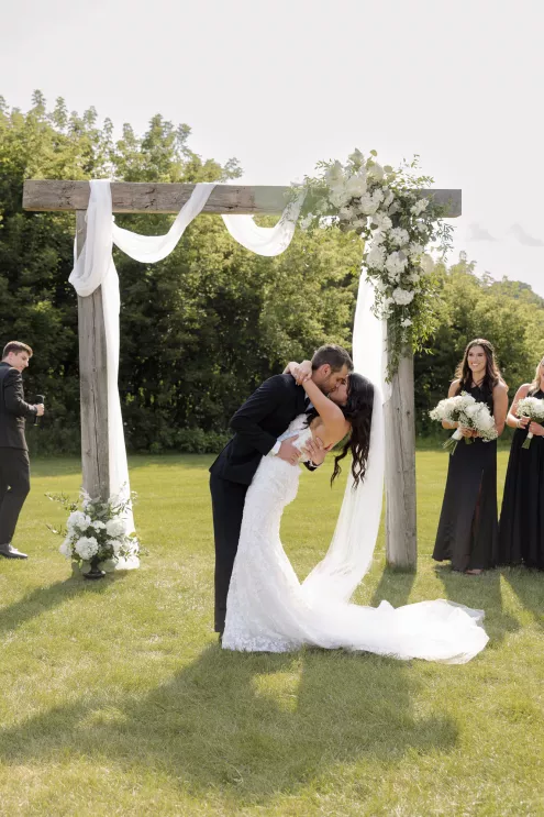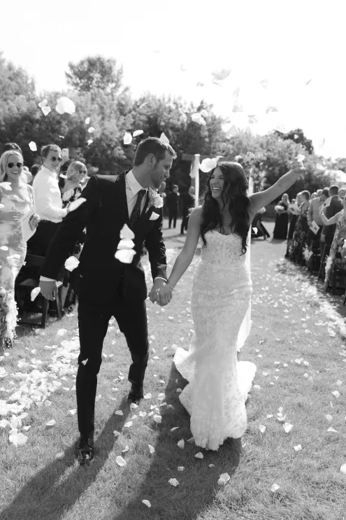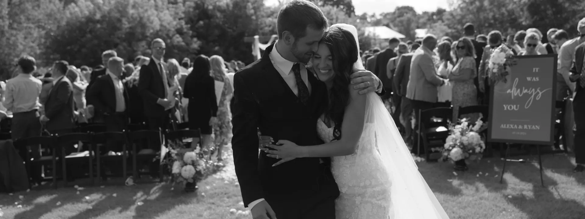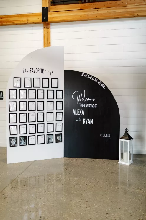High school sweethearts Alexa and Ryan grew into themselves and their love together, enjoying traveling, competitive board games and supporting each other's passions and interests throughout their ten-year relationship. Once they changed their relationship status to "Engaged," the pair moved from Minnesota to Wisconsin, where their nuptials would be held on the picturesque grounds of Fête. Opting for a traditional wedding day, a black-and-white palette set the tone for intimate elegance with modern details woven throughout. Alexa wore a strapless gown adorned with tiny petal-like lace with her long dark hair styled in loose, romantic waves while her bridesmaids wore an array of black silk and chiffon dresses. Before the ceremony, Ryan and Alexa shared their first look and exchanged private vows, which was an aspect of the day they couldn't recommend more to engaged couples planning their weddings, as it gave them a private moment and having captured their couple portraits allowed them to enjoy cocktail hour with their friends and family later in the day. White petals lined the grassy aisle leading to an organic wooden altar with dreamy drapery framing the couple as they became husband and wife. Celebratory signature cocktails, Old Fashioneds and Dirty Shirleys were served with commemorative charms during cocktail hour before modern geometric signage led guests to the reception. Wanting to experience their wedding day revelry to its maximum capacity, Alexa and Ryan told their guests if they wanted to see or talk to them during the evening, "You better get on the dance floor, because that's where we'll be."