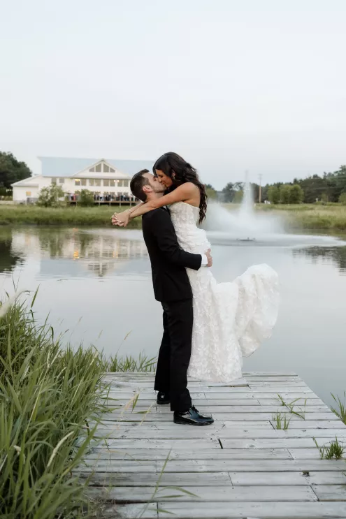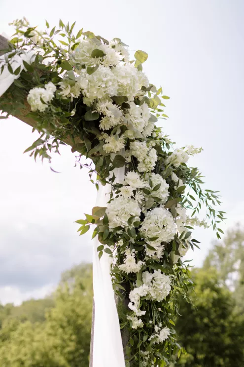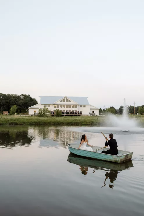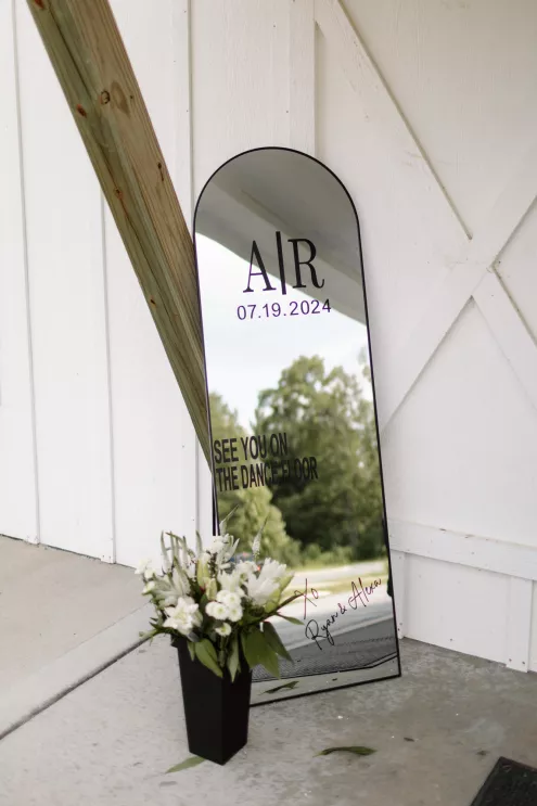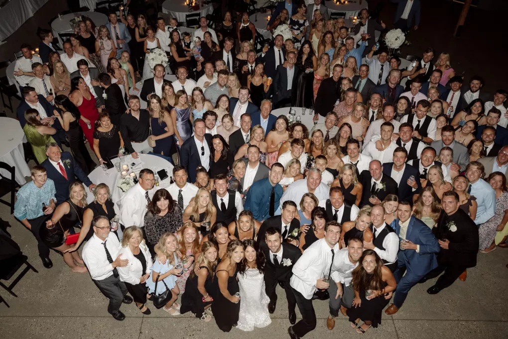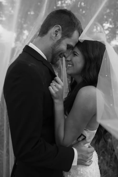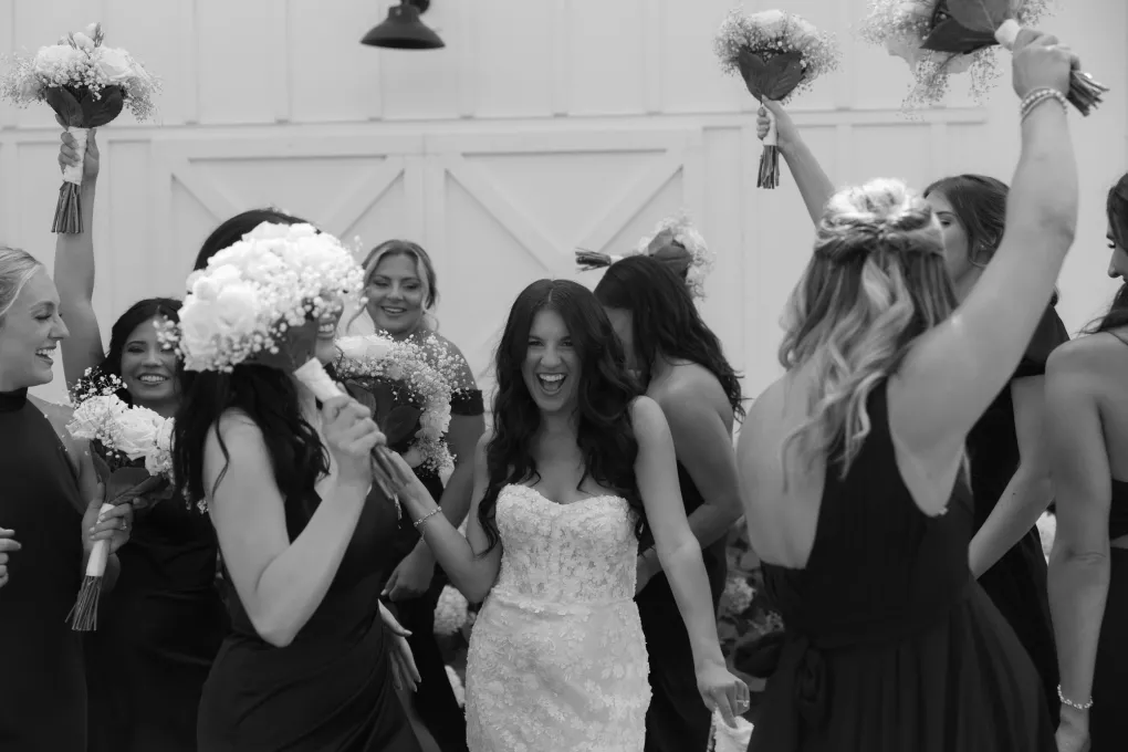 High school sweethearts Alexa and Ryan grew into themselves and their love together, enjoying traveling, competitive board games and supporting each other's passions and interests throughout their ten-year relationship. Once they changed their relationship status to "Engaged," the pair moved from Minnesota to Wisconsin, where their nuptials would be held on the picturesque grounds of Fête. Opting for a traditional wedding day, a black-and-white palette set the tone for intimate elegance with modern details woven throughout. Alexa wore a strapless gown adorned with tiny petal-like lace with her long dark hair styled in loose, romantic waves while her bridesmaids wore an array of black silk and chiffon dresses. Before the ceremony, Ryan and Alexa shared their first look and exchanged private vows, which was an aspect of the day they couldn't recommend more to engaged couples planning their weddings, as it gave them a private moment and having captured their couple portraits allowed them to enjoy cocktail hour with their friends and family later in the day. White petals lined the grassy aisle leading to an organic wooden altar with dreamy drapery framing the couple as they became husband and wife. Celebratory signature cocktails, Old Fashioneds and Dirty Shirleys were served with commemorative charms during cocktail hour before modern geometric signage led guests to the reception. Wanting to experience their wedding day revelry to its maximum capacity, Alexa and Ryan told their guests if they wanted to see or talk to them during the evening, "You better get on the dance floor, because that's where we'll be."