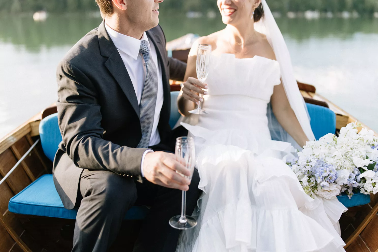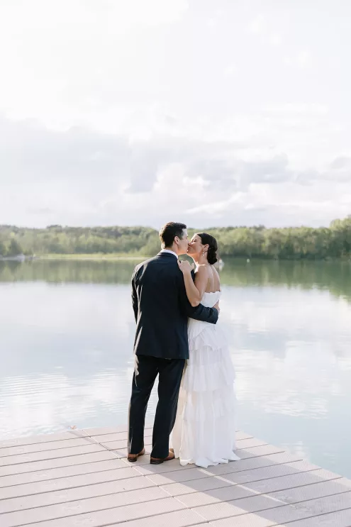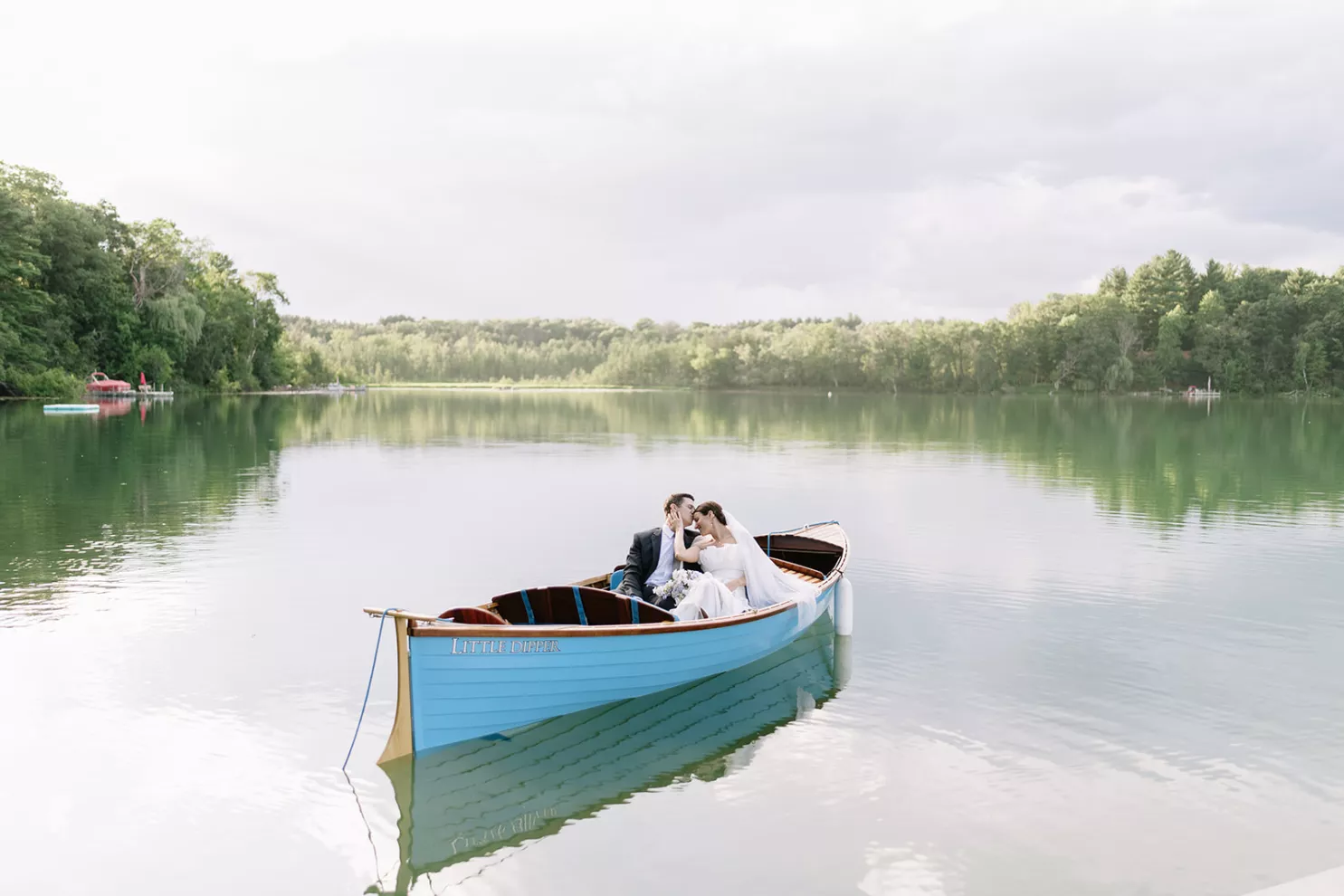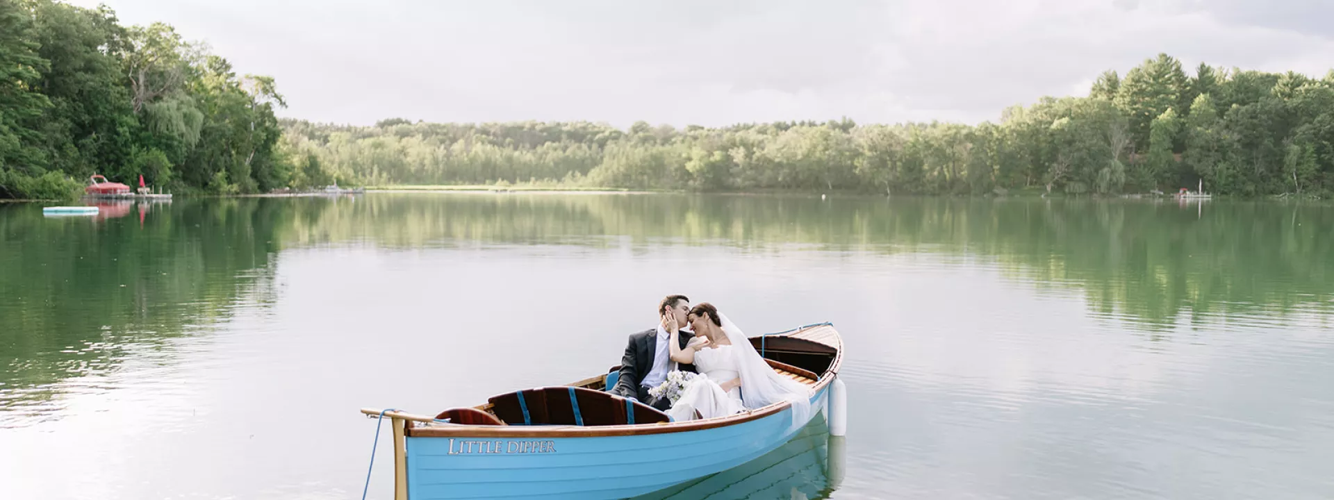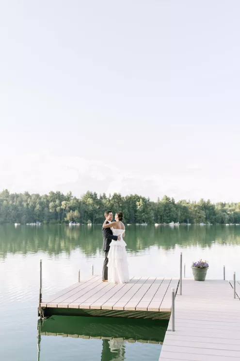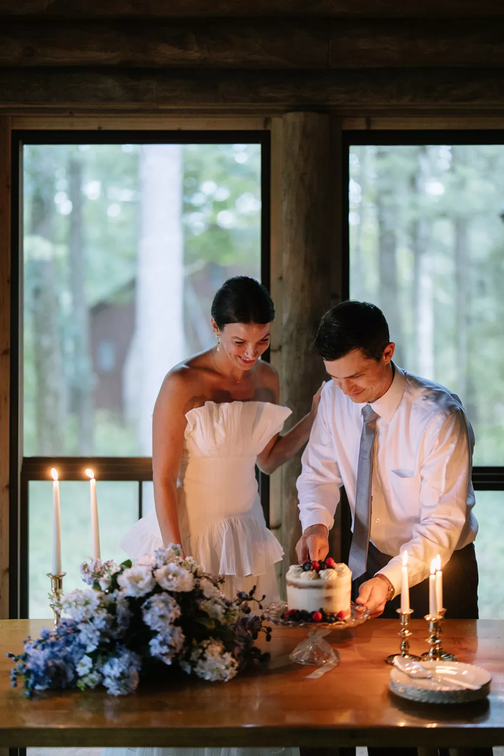 After Jessica and Daniel's 48-hour road trip first date, the pair knew they wanted to spend the rest of their lives by each other’s side. The intimacy of that date was reflected on their wedding day, the happy couple opting for an ultra-private elopement with only their parents bearing witness at Daniel's family cabin in Wautoma. Surrounded by tall pines, Jessica married the love of her life in a soft, layered gown with an ivory silk wrapped bouquet of white and lavender blooms in hand. In celebration, the newlyweds hopped in a vintage wooden boat named "Little Dipper" and floated on the water with champagne in hand, soaking in the first moments of married life. To cap off the special evening, Jessica and Daniel cut a vanilla frosted cake decorated with ripe summer berries in the glow of romantic candlelight, under their parents' loving gaze.