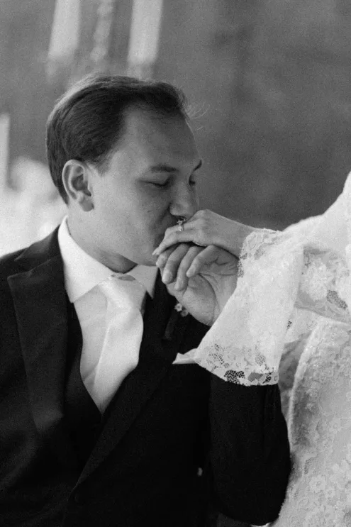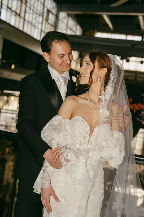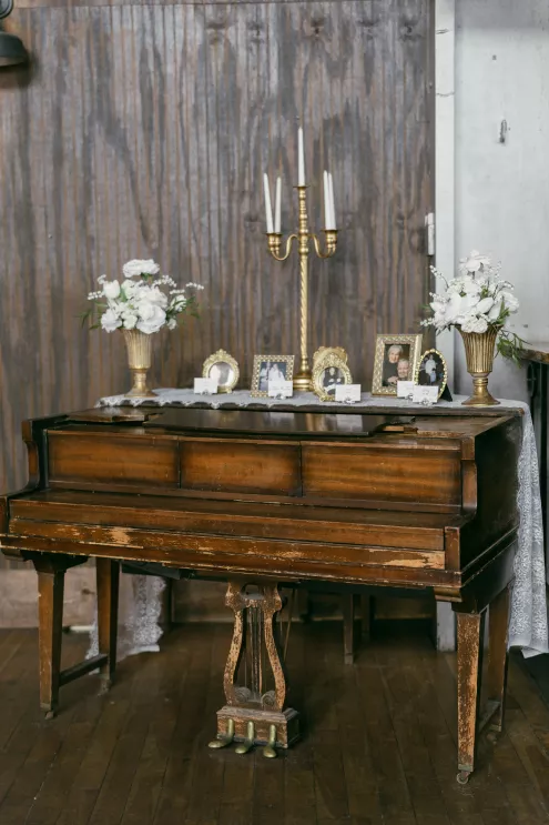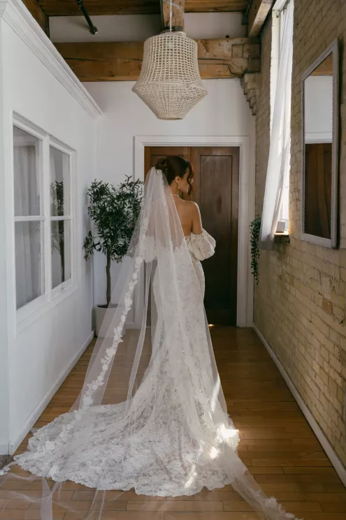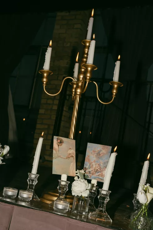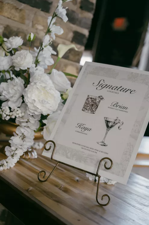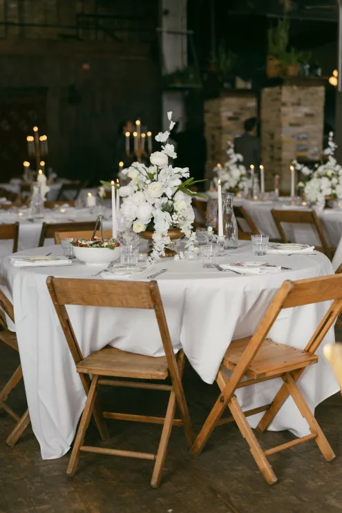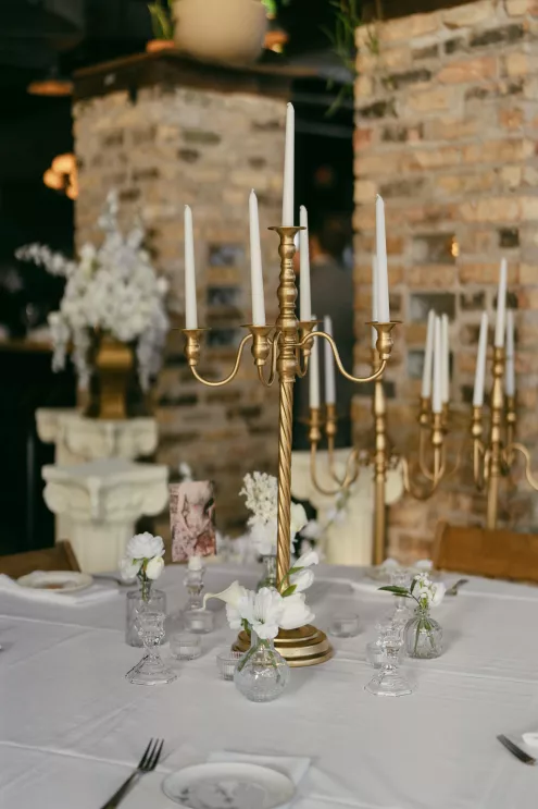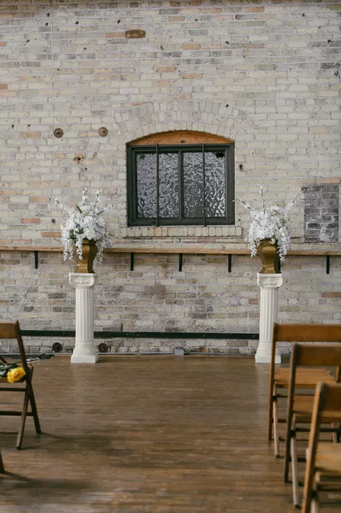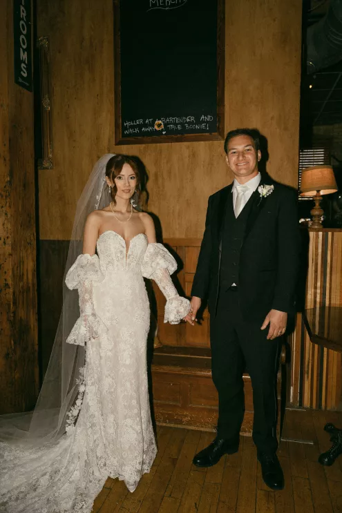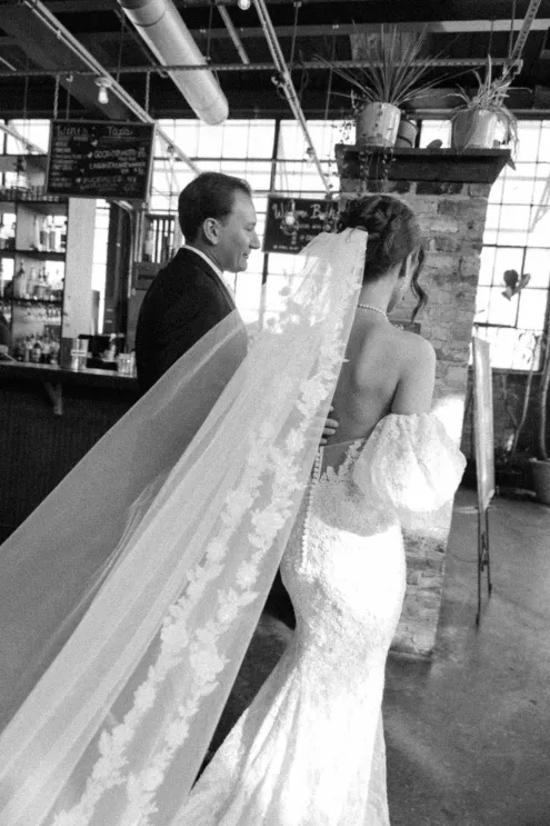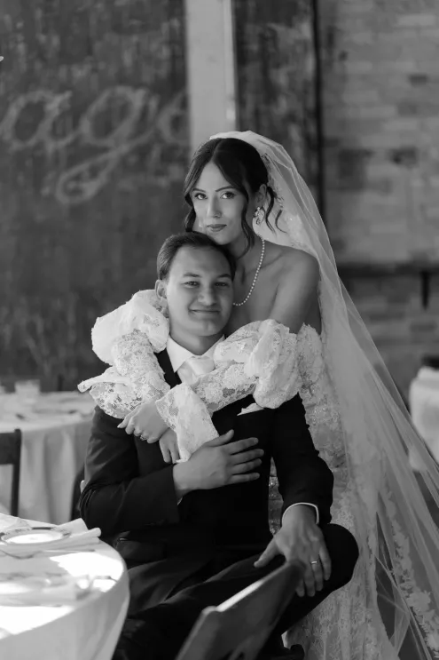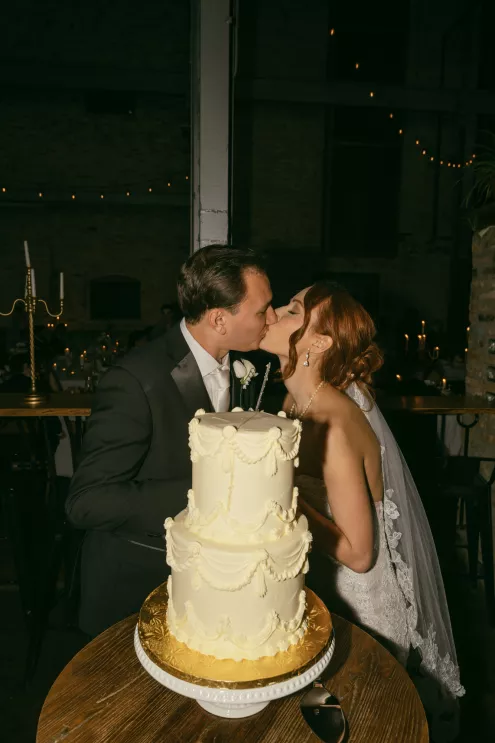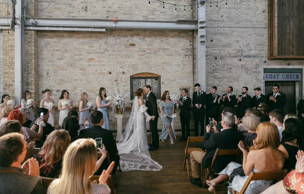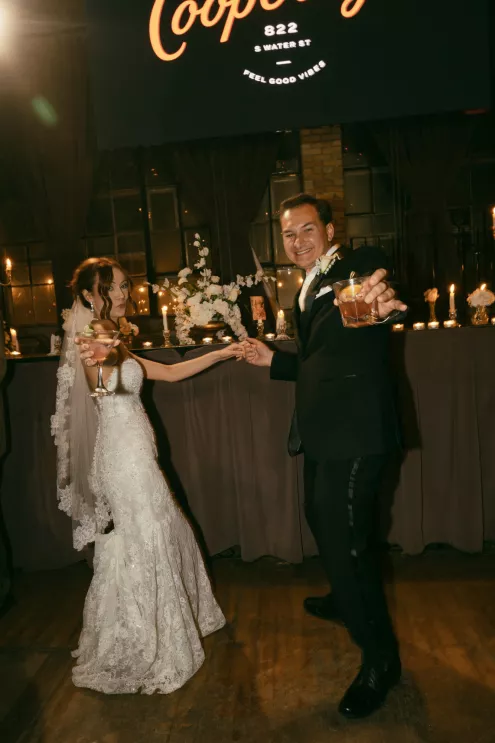 Old souls Kaya Heller and Brian Jansen never anticipated they would find their soulmates at a local Pick-N-Save, but thanks to Brian’s courage to break the ice, their instant connection developed into a lifetime of love. Inspired by their shared affinity for vintage aesthetics and their favorite television show, The Gilded Age, the couple chose elegant simplicity for their wedding day at The Cooperage. White florals curated and handcrafted by the bride and her family were offset by the exposed brick of the expansive venue. The muted silken hues of the bridal party’s attire provided the sole pop of color in an otherwise monochromatic palette. Kaya wore a dreamy, vintage- inspired gown composed of layered lace, accented with gigot sleeves, a delicate string of pearls and a lace-trimmed veil. Brian stood at the altar in a classic suit as Kaya walked down the aisle to “Thank You” by Led Zeppelin, a heartfelt nod to the deep gratitude they hold for one another. The reception exuded warmth and charm, with glowing golden candelabras illuminating the room, antique glassware, metallic-edged plateware and retro photo cards. Softly playing Lana Del Rey songs contributed to the effortlessly moody ambiance, which culminated in the newlyweds cutting their Lambeth-style cake as a sweet conclusion to their timeless wedding day.