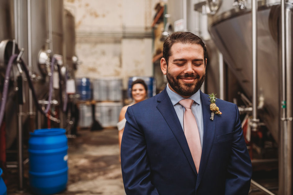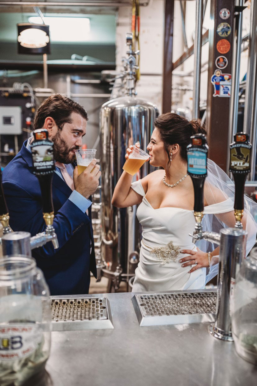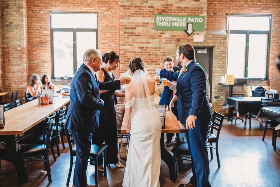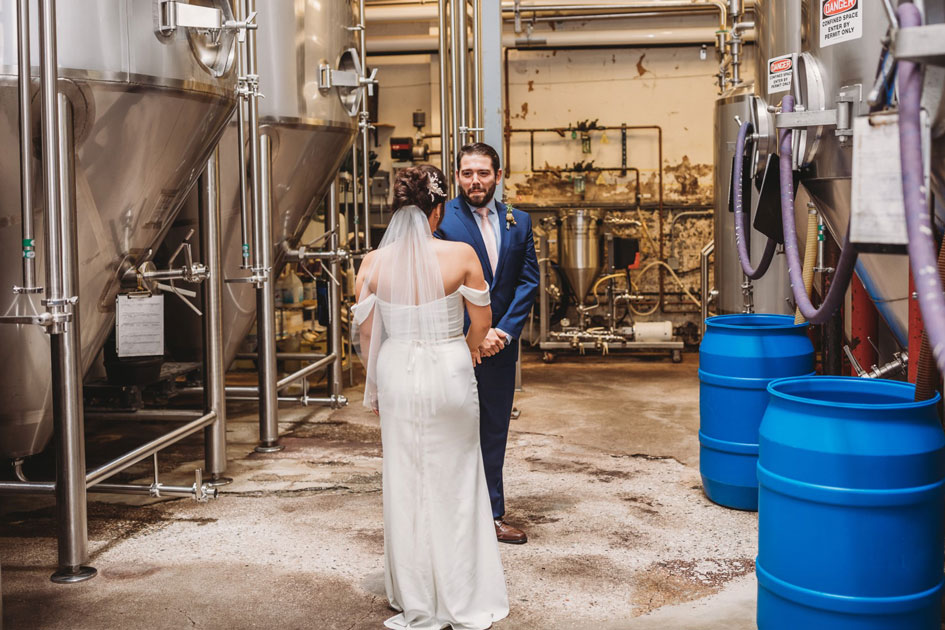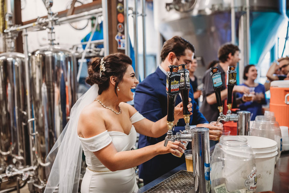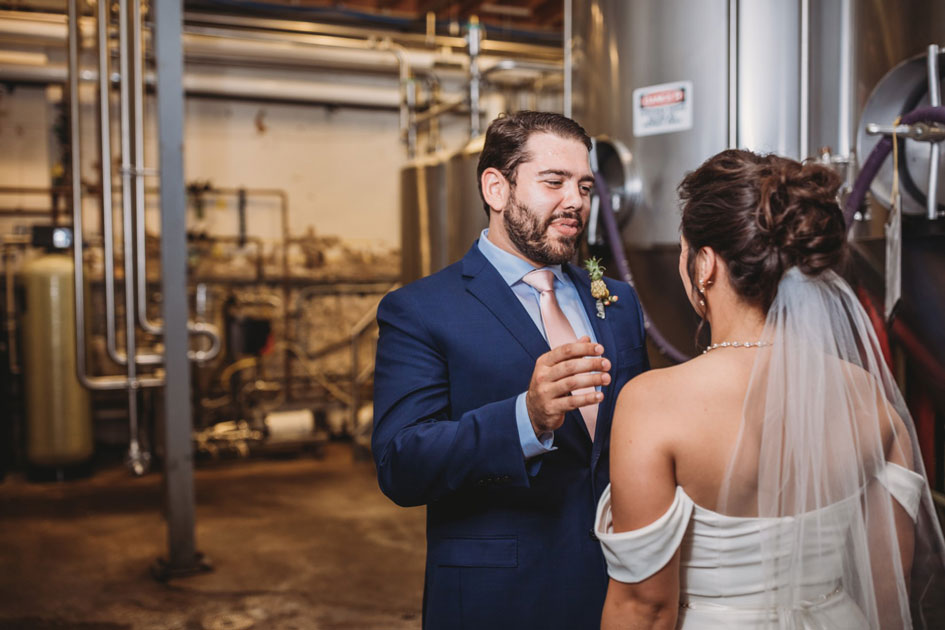 Two years later, Adam and Callie held their first look inside the same brewery that brought them together. After a few photos, they stopped to pour a beer for a tour group before heading over to their wedding. Following their inimate ceremony at DiModa Pizza, close family and friends gathered for a fun-filled evening of dinner and drinks. For the groom, the memory that stands out is receiving his wedding band and finding it was inscribed with the words his grandfather wrote in every love letter: "always and always, I'll love you, darling."