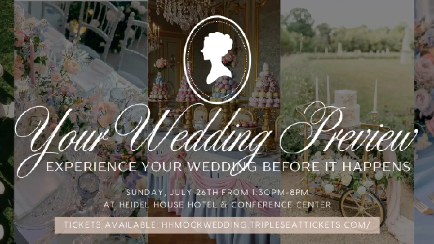 You are cordially invited to Your Wedding Preview—a most splendid Bridgerton-inspired affair hosted at Heidel House Hotel & Conference Center, where romance, elegance, and wedding-day wonder shall take center stage